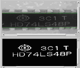 效果和结论 我们运用美国NI公司的LabVIEW、IMAQ Vision以及PXI等先进的虚拟仪器技术,通过众多图像处理模块的功能实现,在较短时间内建立了一套完整的芯片表面标识自动识别系统。该系统能够自动定位跟踪摄像头视场中的芯片,将芯片剪切出来,然后通过一系列的图像处理过程,对芯片上的文字进行逐一提取,再对文字图像进行细化,最后系统通过文字的细化结果等获取图像的特征信息,并与标准模板进行匹配,从而完成对文字的识别。系统具有较广范围的适用性,能够完成包括厂商标志图标等对象的识别;还具有较高的实用价值,配合芯片自动测试系统,将极大提高生产能力和效率,因此具有极其广阔的应用前景。
